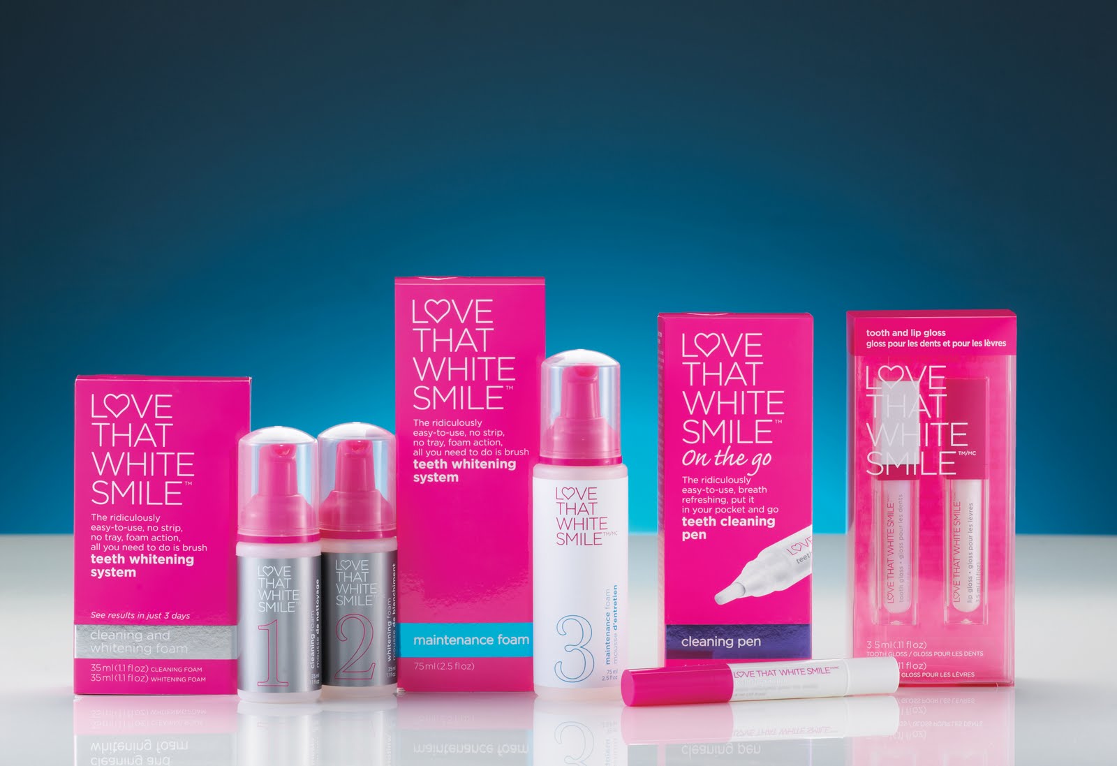 Love That White Smile consists of a four-piece product line that ensures a whiter, brighter smile with products so gentle that they are even appropriate for sensitive teeth. I received the cleaning and whitening foams, the maintenance foam, the on-the-go teeth cleaning pen and the tooth and lip gloss for review. The cores of the system are the cleaning and whitening foams, two separate products that are used at the same time for effective and gentle whitening.